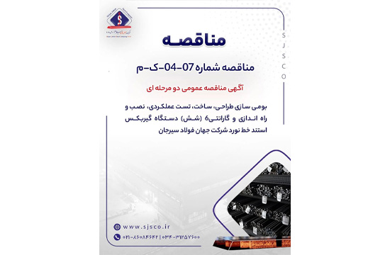 شرکت جهان فولاد سیرجان در نظر دارد نسبت به بومي سازي طراحي، ساخت، تست عملكردي، نصب و راه اندازي و گارانتي6 (شش) دستگاه گيربكس استند خط نورد از طریق برگزاری مناقصه عمومی دو مرحله ای اقدام نماید؛ لذا از تمامی شرکت های معتبر که دارای توانایی مناسب، سوابق و تجارب مورد قبول می باشند، دعوت به عمل می آید اسناد مناقصه را از طریق مراجعه به آدرس اینترنتی WWW.SJSCO.IR دریافت نمایند.