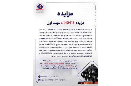 شرکت جهان فولاد سیرجان در نظر دارد مقدار حداکثر 6000 تن شمش 3spیا5sp (150*150)مازاد بر نیاز خود را طبق آنالیز شیمیایی و سبد اقلام مندرج در اسناد مزایده از طریق مزایده عمومی بفروش برساند. متقاضیان شرکت در مزایده می توانند جهت آگاهی از شرایط عمومی مزایده و دریافت اوراق مزایده و ارائه پیشنهاد همه روزه به استثنای ایام تعطیل رسمی، پنجشنبه و جمعه از تاریخ 1404/08/18/ لغایت 1404/08/26 از ساعت 8 صبح الی 12 به آدرس تهران، میدان ونک، بزرگراه حقانی بعد از جهان کودک، خیابان شهیدی، کوچه ژوبین، پلاک 2، طبقه 2 مراجعه نموده و یا با شماره تماس 03431257610 و 02186084642 واحد بازرگانی فروش تماس حاصل نمایند.