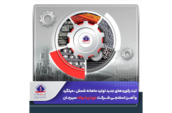 ثبت رکوردهای جدید تولید ماهانه شمش ، میلگرد و آهن اسفنجی شرکت جهان‌فولاد سیرجان شرکت جهان‌فولاد سیرجان با اتکا به الطاف الهی و با بهره‌گیری از تلاش‌های خستگی‌ناپذیر کارکنان و پیمانکاران خود، موفق به ثبت سه دستاورد مهم در حوزه تولید محصولات فولادی شد. کارخانه فولادسازی این شرکت با تولید ۹۳,۶۹۵ تن شمش فولادی در آبان ماه، رکورد جدیدی را به نام خود ثبت کرد. کارخانه نورد بردسیر نیز با دستیابی به تولید ۴۰,۸۰۳ تن میلگرد، موفق شد رکورد ماهانه خود را رقم بزند.
