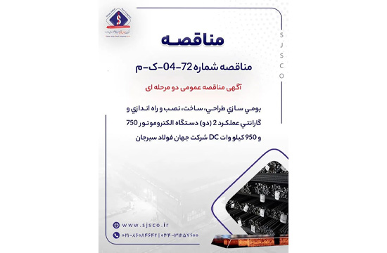 شرکت جهان فولاد سیرجان در نظر دارد نسبت به بومي سازي طراحي، ساخت، نصب و راه اندازي و گارانتي عملكرد 2 (دو) دستگاه الكتروموتور 750 و 950 كيلو وات DC از طریق برگزاری مناقصه عمومی دو مرحله ای اقدام نماید؛ لذا از تمامی سازندگان معتبر که دارای توانایی مناسب، سوابق و تجارب مورد قبول می باشند، دعوت به عمل می آید اسناد مناقصه را از طریق مراجعه به آدرس اینترنتی WWW.SJSCO.IR دریافت نمایند.