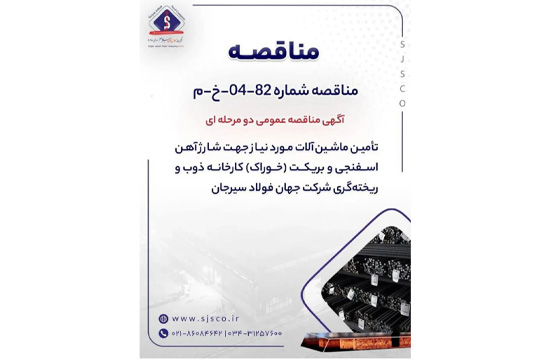 شرکت جهان فولاد سیرجان در نظر دارد نسبت به تأمین ماشین‌آلات مورد نیاز جهت شارژ آهن اسفنجی و بریکت (خوراک) از طریق برگزاری مناقصه عمومی دو مرحله ای اقدام نماید؛ لذا از پیمانکاران معتبر بومی استان کرمان یا دارای کارگاه فعال در شهرستان سیرجان با سایر شرایط مندرج در اسناد مناقصه، توانایی مناسب، سوابق و تجارب مورد قبول می باشند، دعوت به عمل می آید اسناد مناقصه را از طریق مراجعه به آدرس اینترنتی WWW.SJSCO.IR دریافت نمایند. • شرایط: