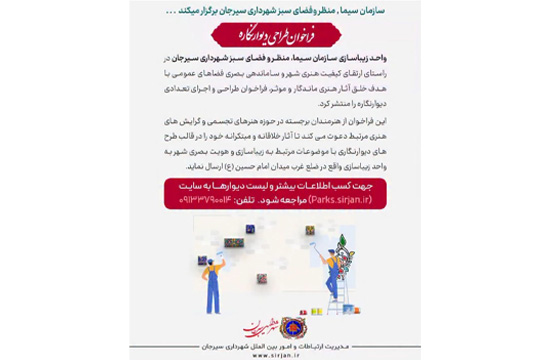 سازمان سیما، منظر و فضای سبز شهرداری سیرجان برگزار میکند ... فراخوان طراحی دیوارنگاره واحد زیباسازی سازمان سیما، منظر و فضای سبز شهرداری سیرجان در راستای ارتقای کیفیت هنری شهر و ساماندهی بصری فضاهای عمومی با هدف خلق آثار هنری ماندگار و موثر، فراخوان طراحی و اجرای تعدادی دیوارنگاره را منتشر کرد. این فراخوان از هنرمندان برجسته در حوزه هنرهای تجسمی و گرایشهای هنری مرتبط دعوت میکند تا آثار خلاقانه و مبتکرانه خود را در قالب طرحهای دیوارنگاری با موضوعات مرتبط به زیباسازی و هویت بصری شهر به واحد زیباسازی واقع در ضلع غرب میدان امام حسین (ع) ارسال نمایند. جهت کسب اطلاعات بیشتر و لیست دیوارها به سایت (Parks.sirjan.ir) مراجعه شود. تلفن: ۰۹۱۳۳۷۹۰۰۱۴ مدیریت ارتباطات و امور بین الملل شهرداری سیرجان